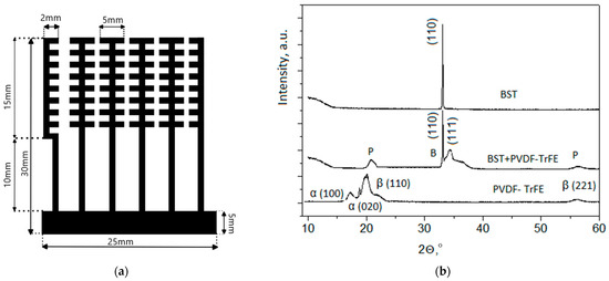 Design of the measured sample (a) and XRD patterns of BST, PVDF-TrFE, and BST+PVDF-TrFE composite (b).