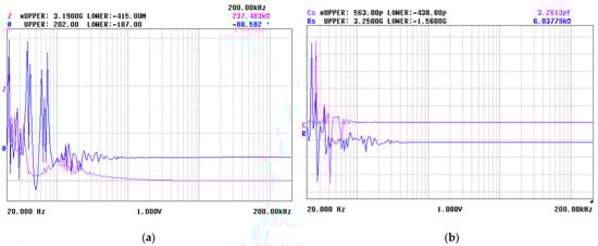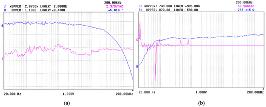 The low capacitance of ~3.2 pF (Figure 2a) can be ascribed to partial dielectric relaxation of polarization charges and, thus, significant enhancement of the piezoelectricity should not be expected in contrast to the multilayer hybrid sample. Furthermore, the Bode plot showed two orders of magnitude higher impedance of ~237.4 kΩ for the single layer device (Figure 2a), which is an indication of higher voltage drop over the piezoelectric element at open circuit and, therefore, can serve as a voltage source only, without having the ability to produce sufficient current for power harvesting function [35]. The value of the phase shift angle of −88° shows dominant inductive character of the BST-based element, which can be ascribed to the parasitic inductance of the contacts due to the sharp formations in the film topology and the unstable point contact between the functional film and the electrode layer. On the contrary, the impedance of the composite device was found to be ~2.3 kΩ, which meant a better ability to provide current flow when a load was attached. In addition, the Theta value of −5° showed that the overall behavior of the element was away from inductance, which further confirms that the polymer introduction resulted in smooth surfaces in contact with the electrodes, leading to improved interface conditions of the piezoelectric hybrid transducer. These results are proof that the introduction of a composite between the piezoelectric oxide and polymer is an efficient approach to improve the contact conditions of the system, which is a prerequisite for enhanced piezoelectricity and optimized power output.