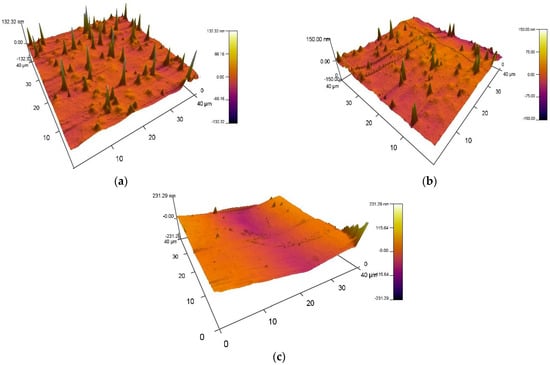 Comparing the two samples, it can be seen that the capacitance of the non-hybrid BST device (Figure 2b) was four orders of magnitude lower than the value measured for the PVDF-TrFE/BST/PVDF-TrFE sample (Figure 3b). The latter was a sum of the contributing capacitances of the two materials [34]. The contact resistance was two orders of magnitude lower for the hybrid device (Figure 3b), as compared to the single BST device (Figure 2b), which was due to the lower surface roughness of the multilayer stack and the contacting surfaces to the electrodes. This hypothesis was further confirmed by the AFM study of the BST on PEN, BST on PVDF-TrFE-coated PEN, and the PVDF-TrFE film on BST/PVDF-TrFE/PEN, shown, respectively, in Figure 4a–c.