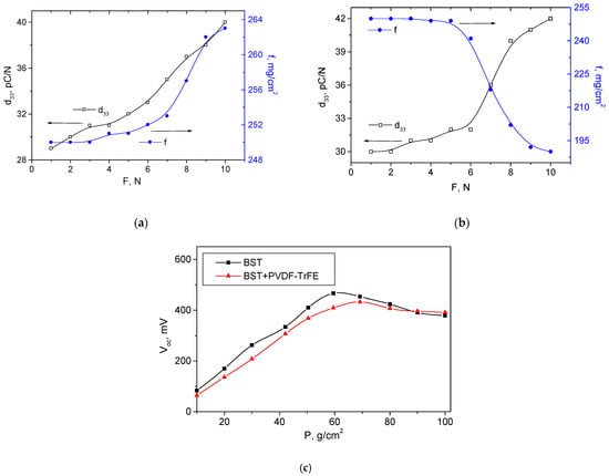 As can be seen in Figure 5a, by increasing the external force over the BST-based device, the internal forces almost exponentially increased from 250 to 263 mg/cm2. As a consequence, the piezoelectric coefficient also slightly increased from 29 to 40 pC/N, following a similar trend of rising, similar to the internal force. The results, however, showed untypical behavior of the internal force experienced from the hybrid device, although the curve of the d33 remained similar, as compared to the single layer device, as is visible from Figure 5b. A reason for this could be that the polymer layer (PVDF-TrFE) absorbs the mechanical waves, which in turn do not fully reach the next piezoelectric layer consisting of BST. Another possibility is anisotropy in the PVDF-TrFE-sprayed layer, whose response was weaker when force was applied in the vertical direction and the charge was measured in the same direction compared to a case where the vibration propagated horizontally, i.e., the coefficient d31 could possibly be greater than d33. This will be clarified at a later stage during the dynamic test, where, if this hypothesis is not true, the sample will not exhibit a strong piezoelectric response at resonance. The sensitivity of the two kinds of transducers was similar, considering the dynamic range of the piezoelectric coefficient at constant force applied. A plot of open circuit voltage versus pressure at a resonant frequency for the BST only and hybrid BST+ PVDF-TrFE multilayer device was shown in Figure 5c. As is seen, the hybrid device exhibited a gradual increase in the output voltage and at loading near 70 g/cm2, the voltage remained stable, showing small variation and negligible decrease in the voltage. This limit of the response can be ascribed to the small thickness of the film, resulting in relatively fast orientation of the dipoles, after which the piezoelectric effect decayed due to large strain induced in the lattice and depolarization fields [36]. In contrast, the BST single material sample showed its maximal output voltage (although higher than the voltage of the hybrid device) at a lower loading of ~60 g/cm2 and a consequent gradual decrease in the voltage with a rate 525 µV/g. This effect can be ascribed to defects in the lattice and structure degradation due to the brittleness of barium strontium titanate. This is a proof for the contribution of the PVDF-TrFE materials to the durability and reliability of the energy harvester.