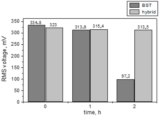 The RMS voltage for the BST sample decreased by 6% after one hour of bending and dropped sharply to 70.1% after 2 h due to degradation of the film and probably degradation of the interfaces [37]. On the contrary, the hybrid device exhibited stable electrical behavior against the time, which is evidence of the reinforced strength of the sample due to the insertion of the piezoelectric polymer with low Young modulus, partially absorbing the intensity of the mechanical loading in such an extent to avoid BST film degradation, and at the same time, to keep the output voltage and current competitive to the BST-only device. The relative instability of the RMS voltage for the hybrid device was 2.3% after one hour of bending and remained almost unchanged after 2 h, namely 2.9%, which is not significant degradation.