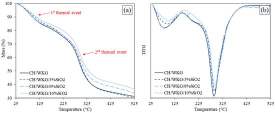 The second column of Table 2 indicates the temperature at which 5% of mass loss occurred in each sample. The control film (CH/WKG) shows this mass loss at 68.3 °C, while the CH/WKG10%SiO2 sample shows a 5% mass reduction at 75.7 °C. At the same time, it is verified that the Tonset of the first thermal event also increases from the incorporation of the nanosilica. However, the Tonset of the second thermal event apparently has no significant change from the incorporation of the nanosilica. Therefore, it is suggested that nanoparticles increase the moisture-associated stability of the films. These findings indicate that the nanosilica enables moisture retention in a more pronounced way. In addition to films with higher MC values, the water retained in the agglomerated nanoparticles binds more intensely with this material, requiring a greater amount of energy to remove it from the films.