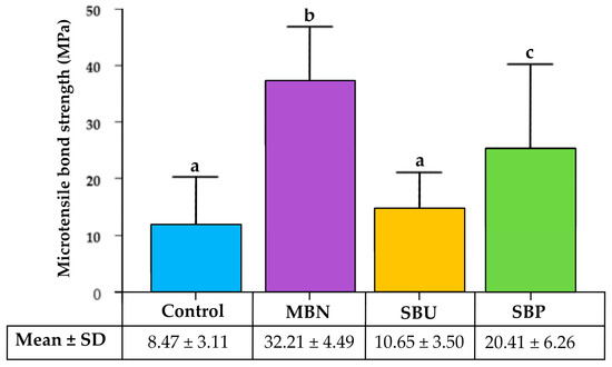 The means ± standard deviations (SDs) of resin-ceramic microtensile bond strength (μTBS) (expressed in MPa) of Group 1 (control), no priming; Group 2, primed with MBN; Group 3, primed with SBU; and Group 4, primed with SBP. Different superscript letters indicate statistically significant difference (p < 0.05) between groups.