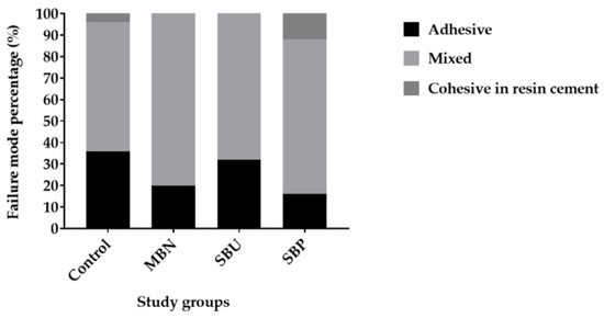 Frequencies of failure modes (expressed as percentages) recorded for tested μTBS microbeams of following groups: control (no priming), MBN, SBU, and SBP.