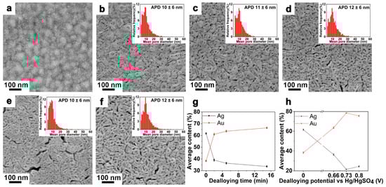 According to Figure 2a, the Au-Ag film was quite dense, and no obvious pores or cracks were observed, but some granular structure can be observed, which is a typical morphology of the sputtered surface [23]. Very fine nanopores form after dealloying under 0.66 V for 2 min. The average pore diameter was measured to be 10 ± 6 nm. With extending the dealloying time or increasing the dealloying potential, the average diameter of the pores kept stable around 10~12 nm, while the density of the pores increased and cracks started to form. The cracks may have been induced by the stress created during the dealloying processes [24,25,26,27].