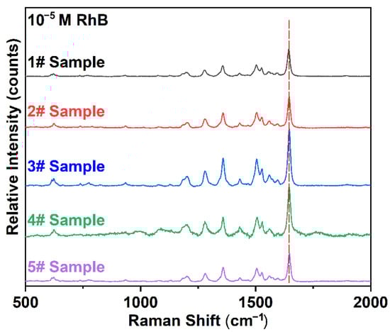 Figure 3 shows the SERS spectra of the dealloyed samples with 10−5 M RhB adsorbed. According to the previous literature [3,28,29], the main shifts of the RhB molecule were indexed, and the results are listed in Table 2. The intensity of the feature shifts (@1646 cm−1) increases with extending the dealloying time (1#, 2#, and 3# samples). The composition and the number of hot spots are the main affected factors to determine the SERS activity of the substrate. The hot spots are commonly contributed by the sub-10-nm gaps [3,16]. It can be seen from Figure 2 that the density of the fine nanopores increases with the dealloying, which may lead to the increasing of hot spots. The newly formed cracks may also create some new hot spots. In addition to that, the Au content also increases with the dealloying time. Due to the relatively easy oxidization of Ag [3,25,26], the increasing of Au content in the Au-Ag substrate improves the SERS performance. It is also noticed that the SERS activity of the sample first increases and then decreases with the increasing dealloying potential (2#, 4#, and 5# samples). The decreasing SERS activity may be caused by the decreasing Au content under high dealloying potential.