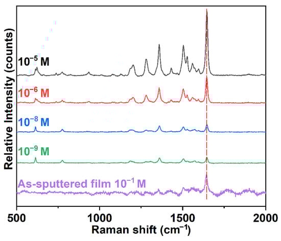 Figure 4 shows the SERS spectra of RhB with concentrations from 10−5 M to 10−9 M on 3# sample. The intensity of the Raman shifts keeps decreasing with decreasing RhB concentration. After the Lorentz fitting, the intensities of the Raman shift @1646 cm−1 were measured. As listed in Table 3, the intensity of the Raman shifts of RhB concentrations of 10−5 M, 10−6 M, 10−8 M, and 10−9 M were 17,795 counts, 6137 counts, 2279 counts, and 1243 counts, respectively. Thus, the detection limit of the sample was lower than 10−9 M, which was much better than the previous reports [16,30,31]. The Raman spectrum of the Au-Ag film with 10−1 M RhB adsorbed was also measured, as shown in Figure 4.