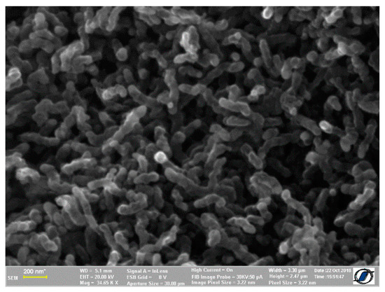 The new MWCNT used in this research as a possible solution to mitigate the issues related to using surfactants and sonication procedures was based on the same CVD method. These new carbon-based nanotubes (CBN) had a diameter of 30–40 nm and a length in the range of 200–400 nm, as measured from the SEM image shown in Figure 2. Anhydrous iron chloride (FeCl2) was introduced in the center of a quartz tube electric furnace which was then evacuated to a pressure of about 1 mTorr using a rotary pump. The furnace was then heated up to a temperature of 900 °C with ramping rate of 40 °C/min. When the synthesis temperature was reached, acetylene (C2H2) was introduced into the reaction chamber at a flow rate of 0.5 L/min. The growth pressure was kept constant around the value of 10 Torr for a growth time of 60 min. Finally, the chamber was naturally cooled down to room temperature under vacuum and particles were collected using a permanent magnet.