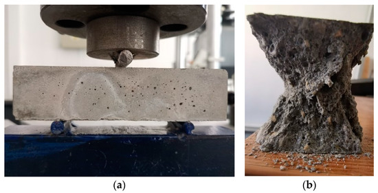 The flexural strength of mortar mixes was determined at the age of 28 days by means of 3-point bending test conducted at a loading rate of 50 N/s in accordance with [31], as shown in Figure 4a. The resulting half prisms were examined for signs of visible cracks and then subjected to uniaxial compression test, Figure 4b, with a loading rate of 2400 N/s [31].