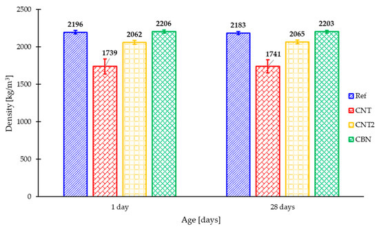 Figure 5 shows the change in the values of density 1 day from casting to the day of testing. The values of the density represent the mean value of nine determinations. Minor variations, less than 0.6%, were observed between the two sets of values. This would suggest a geometrical stability of the specimens and the fact that the available mixing water was replaced by cement hydration products. Similar trends were reported in the scientific literature for cement mortar incorporating superabsorbent polymers [32]. The influence of the SDS surfactant on the values of density is significant with a 20% decrease compared to the reference mix. This may be due to the increased porosity of the hardened mortar, as reported in the scientific literature [33]. As previously mentioned, no anti-foaming agent was used in the CNT mix. For the CNT2 mix, where the anti-foaming agent was used, the density was similar to the reference mix and CBN mix. The value was 5.43% and 6.26% smaller compared to the reference mix and CBN mix, respectively. The influence of the surfactant on the density of mortar could not be entirely reduced by the use of tributyl phosphate.