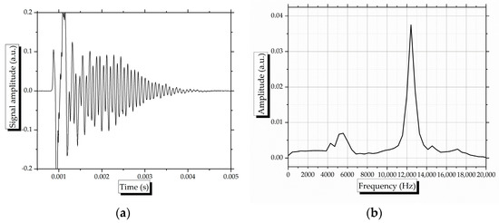 The free vibration response of all specimens (nine for each of the mix proportions presented in Table 2) was recorded, as shown in Figure 6a for the Ref mix, using the experimental set-up presented and considerations described in [34]. The fast Fourier transform (FFT) was applied to the recorded signal in order to obtain the response spectrum of the specimens, as shown in Figure 6b. The latter was used to assess the fundamental longitudinal frequency of vibration for each specimen. For each prism, at least four measurements were considered from which the fundamental frequency of vibration was calculated as the average value.