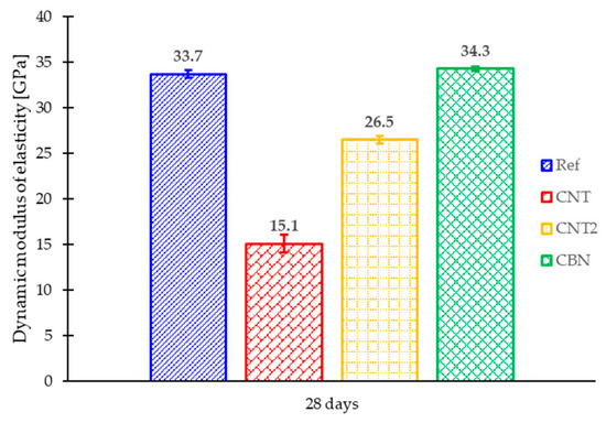 Using an anti-foaming agent led to an increase in the value of the dynamic modulus of elasticity, compared to the mix where only SDS was used, but the obtained value was still lower than that of the reference sample. The decrease, in this case, was 21.36%, still significant considering the benefits one expects from using CNTs. However, taking into account the small percentage of CNTs, the trend observed for the density, and considering the shape of Equation (1), the obtained values of the modulus of elasticity exhibit the same pattern.