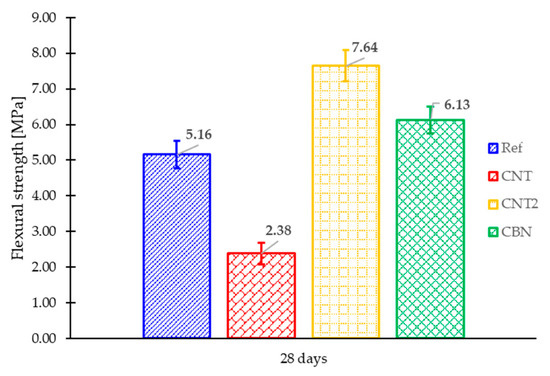 The obtained results from three-point bending tests on nine prisms for each mix proportion are shown in Figure 8. The use of surfactant without an anti-foaming agent results in a significant decrease, 53.83%, in the value of the flexural strength for the CNT mix compared to the Ref one. On the other hand, the use of new CBN results in an 18.76% increase in flexural strength compared to the reference mix. Similar trends, although by a much smaller percentage, were reported in the scientific literature for the same MWCNT dosage in the case of cement pastes [27]. The contribution of both MWCNTs and the new CBN in bridging the micro-cracks in the matrix is quite important, especially in the case of a CNT mix where the pore volume is expected to be large.