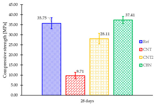 The compressive strength seems to be the most affected material property by the use of SDS surfactant and in the absence of anti-foaming agents. Increased porosity was also reported in the scientific literature when MWCNTs were used, even in the presence of foam reducing admixtures [33,38]. As with previously reported results, the values of the compressive strength for the CNT2 mix was lower than that of both the reference and the CBN mixes. The use of new CBN results in a 4.64% increase in the compressive strength compared to the reference mix.