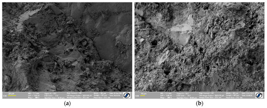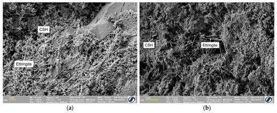 Figure 10 presents the magnified view of the CBN mix as compared to the Ref mix. As it can be seen, the CBN mortar shows a more compact structure whereas in the Ref mix a more pronounced pore concentration was observed. Upon a higher magnification factor, 5000×, Figure 11, the CSH gels in both mixes became more evident. The Ref mix exhibited a less organized and more porous arrangement of the ettringite needles in the structure.