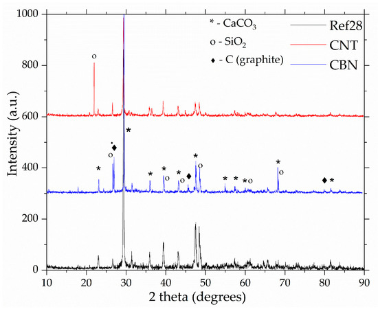 The XRD patterns of the three mixes are shown in Figure 13. Comparing the patterns leads to the conclusion that the introduction of nano-tubes promoted the development of additional crystallographic phases, with a different orientation of SiO2 in the case of CNT mix compared to the Ref mix (at 2 theta = ~22 degrees) as well as in the case of CBN mix (at 2 theta = ~26 degrees).