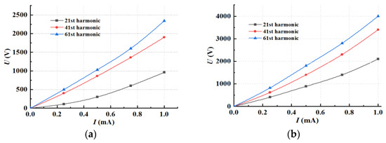 When the applied voltage frequency was 1050 Hz, 2050 Hz, and 3050 Hz, respectively, the voltage amplitude was increased at each frequency, and the change of the total leakage current flowing in each zinc oxide valve sample with each voltage was obtained, as shown in Figure 4a. The leakage current characteristics of the obtained high-gradient valve plate under the same applied voltage frequency are shown in Figure 4b. The resistive leakage current flowing in the D71 high-gradient valve specimen was in direct proportion to the applied voltage. With the increase in voltage amplitude, the resistive leakage current also increased gradually, but the increased amplitude was far less than that of the ordinary valve specimen. The leakage current was the same. Under the 61st harmonic voltage, the withstand voltage of the high-gradient valve was 85% higher than that of the ordinary valve.