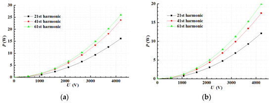 According to the resistive current value of the D71 common valve plate, the active power generated under voltage at different frequencies could be further calculated, and the calculated results are shown in Figure 5a. According to the resistive current value of the D71 high-gradient valve slice, the active power generated under different frequency voltages could be further calculated, and the calculation results are shown in Figure 5b.