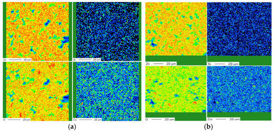 The elemental composition of common-gradient valve plates and high-gradient valve plates was obtained by analyzing the elements inside the plates, as shown in Figure 8a,b. The elemental composition distribution of ZnO in the common-gradient valve plate was agglomerated, and that of the high-gradient valve plate was uniform. At the same time, Co is both solid-soluble in ZnO grains and spinel, which has a relatively small influence on the gradient. Si easily synthesizes silicates with other elements in the valve plates, affecting the flow-through performance of the resistor. It can be seen from the elemental configuration map that the content of Si in the high-gradient valve plate was less, and the Co content and Si content were coordinated with each other, which became the key to improving the function of ZnO.