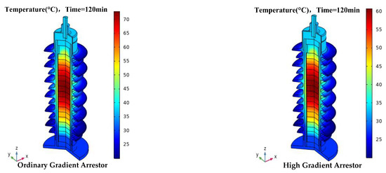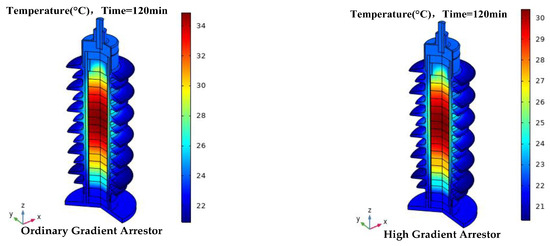 At present, the single arrestor of the EMUs under consideration can withstand a voltage of 42 kV. For ordinary-gradient valve plates, the number of valve plates in a single arrestor is 14, and its operating voltage is 66.5 kV. The number of high-gradient valve plates in an arrestor of the same height, assuming that its action voltage is consistent with that of an ordinary-gradient valve plate arrestor, should be nine, and the rest should be set as aluminum pads, with all of them packaged in an epoxy resin pipeline and coated with silicone rubber. Our model was established by an electro-thermal coupling field in COMSOL to calculate the temperature-rise process and temperature distribution. When the applied voltage was 42 kV, the heat source was the power loss generated by the arrestor under the voltage, and the ambient temperature was 20 °C, the internal heat distribution of the arrestor was obtained at 0–120 min. The temperature distributions of the two kinds of arrestor are shown in Figure 9 and Figure 10 as a rainbow grid.