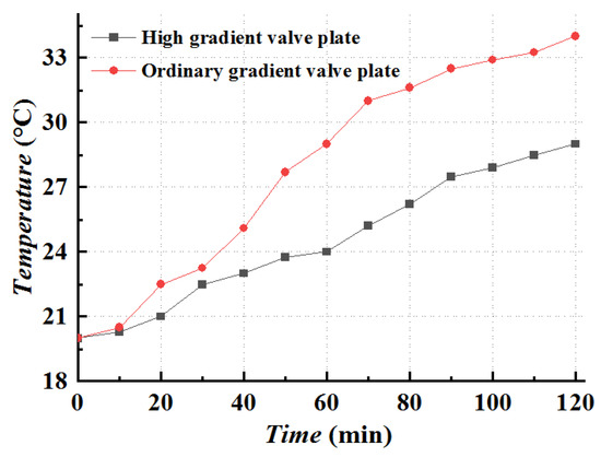 The maximum temperature increase process of an ordinary-gradient valve plate and a high-gradient valve plate under a power frequency condition was obtained, as shown in Figure 11.