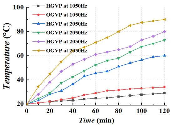 Under the action of high-frequency voltage, the 0–120 min valve temperature increased as compared to normal circumstances, and the higher the voltage frequency, the more the temperature increased; the growth rate also increased. Figure 15 depicts the temperature rise of the valve under various voltage and frequency conditions.