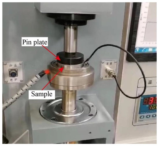 A large pin plate wear test on the surface of the sample was performed at room temperature using an MMW-1A friction and wear testing machine (Jinan Chenda Testing Machine Manufacturing Co., Ltd., Jinan, China). As shown in Figure 3. The friction pair material was 45 steel with φ 4 mm × 12 mm, and the hardness was HRC40-HRC45. The friction and wear test parameters are listed in Table 4.