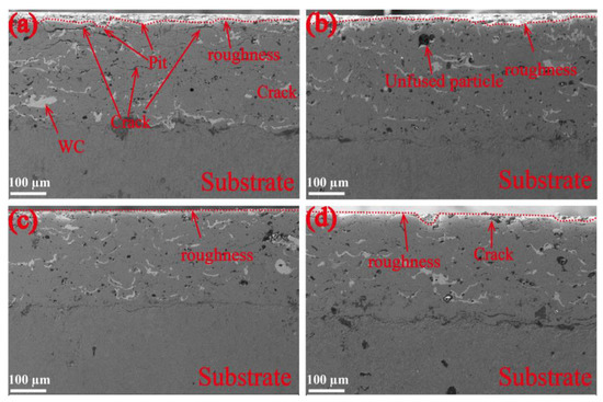 Figure 4 shows the SEM (scanning electron microscope) images of the cross-section of the cermet coatings. Figure 4a indicates that Untreated coating possessed a low density and high surface roughness. A large number of cracks and holes were mainly distributed in the middle and upper parts of the coating, and a mass of unmelted silver–white WC particles were aggregated and unevenly distributed [26]. Plasma spraying heated the metal and ceramic material particles to a high temperature in a very short time, making the materials in a molten and semi-molten state. After spraying to the surface of the substrate, they were solidified by rapid cooling in air. The thermal expansion coefficient and elastic modulus of the metal powder and ceramic particles in the coating were quite different, and the residual stress distribution in the coating and the bonding area between the coating and the substrate exhibited a high amplitude and a large gradient [9], which resulted in cracks and pores in the coating, mainly occurring around the WC ceramic particles with a small thermal expansion coefficient. In Figure 4b, HT + UDR + 0.20 mm coating comprised a higher density, obvious cracks were eliminated, the surface roughness was reduced, the upper pores were eliminated by the flowing material, and the unmelted WC particles were embedded in the coating. The layer was evenly distributed and stretched in a wavy shape along the deep rolling direction. The surface roughness of untreated and HT + UDR treated samples were 1.36, 0.466, 0.335, and 0.387 μm, respectively, as shown in Table 5. Under HT + UDR processing, the coating absorbed enough heat to soften, the atomic spacing increased, the metal bonds became weaker and broken, and plastic deformation was more likely to occur. In addition, the micro peaks were squeezed to flow, and the pits were filled with the material flowing in the micro peaks. The surface cracks were also eliminated, and the internal cracks of the coating were bridged under the action of plastic rheology, which inhibited the large-area expansion of the cracks and the surface cracking. The hardness and brittleness of WC particles decreased, and the tensile deformation in the deep rolling direction exhibited a wavy shape.