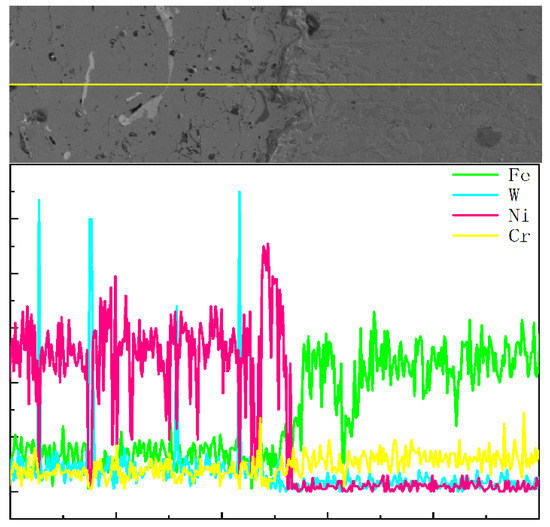 Figure 5 shows the energy spectrum line scanning diagram of the interface of the coating treated by high-temperature ultrasonic deep rolling. The scanning direction was from the coating to the substrate, and the different color curves indicate the changes of the main elements Fe, W, Ni and Cr at the interface. The content of Fe and Cr elements in the transition interface from the coating to the substrate gradually increased, and the content of Ni and W elements gradually decreased at the interface junction. It can be concluded that the element diffusion phenomenon occurred at the interface between the coating and the substrate after the coupling treatment, mainly Fe and Cr diffused from the substrate to the deep rolling coating, and Ni and W diffused from the coating to the substrate. The interface between the coating and the substrate was clear and in the form of occlusion, and the main bonding mode was mechanical bonding [29,30]. After HT + UDR, the lower part of the coating was embedded with the substrate under the action of temperature field and ultrasonic extrusion pressure, which improves its bonding strength.