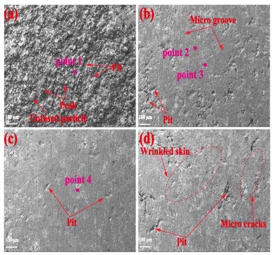Figure 6 shows the surface morphologies of all coatings. The surface of the Untreated coating (Figure 6a) was continuous and uneven, similar to a hill. The melting point of WC powder particles is much higher than that of Ni-based powder particles, and the incompletely melted WC particles accumulated on the surface of the coating, resulting in the diffusion, accumulation, and solidification of droplets after high-speed impact. After the HT + UDR + 0.20 mm processing (Figure 6b), the distance between the surface microgrooves and pits of the coating was equal. Surface grinding was performed before HT + UDR to leave grooves. To avoid cracks, shedding and cracking of the coating occurred under the action of ultrasonic deep rolling, which was due to the large contact friction between the ball and the coating surface. Subsequently, the material underwent plastic flow to fill the grooves, forming microgrooves and pits. Figure 6c shows that both grooves and pits on the surface of the HT + UDR + 0.25 mm coating basically disappeared. With better plastic rheology, enough materials were available to fill pits to obtain better surface quality. In Figure 6d, the grooves on the surface of the HT + UDR + 0.30 mm coating disappeared completely, leaving a large area of potholes. The larger preloading depth generated a more intense deep rolling force impact on the coating surface, exceeding the strength limit of the material itself. The excessive slip of local metal particles produced more significant compressive stress, severe lattice and grain damage distortion, and the falling-off material and fine lines on the coating surface.