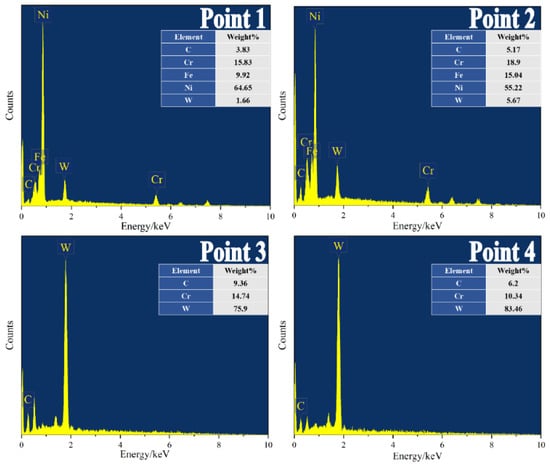 There were a large number of “silvery white” areas on the surface of the HT + UDR coatings, which points 1–4 were analyzed by EDS, as shown in Figure 7. The gray position points 1 and 2 showed that the enrichment of Ni was the most significant, and the peak intensity of Cr and W on the surface of HT + UDR was improved. Cr and C easily formed hard phases at high temperatures, such as Cr7C3 and Cr23C7 compounds [30], which played an important role in improving the strength and hardness of the coatings. The W element was enriched in Point 3 and Point 4 with a silver–white color, which was composed of WC and W2C. WC particles were crushed under the action of the UDR surface. The brittle fracture occurred, which was attributed to the softening of the coating at high temperatures and the embedding of particles on the coating surface under ultrasonic impact. Therefore, the surface quality of the coating was improved under HT + UDR, and more hard phases were generated on the surface, which comprehensively improved its wear resistance.