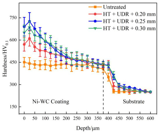 According to the formula, with the decrease in the mean free path of dislocations and the increase in dislocation density, the grain size decreased, and the microhardness increased. The hardness of the Untreated coating varied with different preloading depths, which was less than that of HT + UDR. However, the hardness did not increase with increasing preloading depth, it increased between 0.20 mm and 0.25 mm and then decreased from 0.25 mm to 0.30 mm. Combined with the analysis of the microstructure of the coating, the impact stress on the surface of the cermet coating was more significant when the preloading depth was too high, resulting in wrinkling and micro-cracks on the surface of the coating, and the surface roughness will increase, which had a particular influence on the uniformity of the microhardness. With the increase in the preloading depth, the plastic change layer and work hardening layer of the coating were improved. When the depth was more than 0.25 mm, the maximum microhardness no longer increased, the depth of strengthening also gradually became slow, and the hardness tended to be consistent after reaching the substrate.