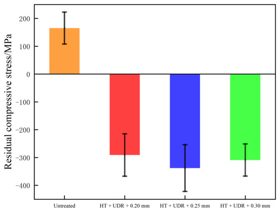 The residual stress in the thermal spraying coating is mostly tensile stress, which has an adverse effect on the comprehensive performance of the coating. The main sources are quenching stress, thermal stress, and structural stress [10]. Figure 9 shows the residual stress of the Untreated, HT + UDR + 0.20 mm, HT + UDR + 0.25 mm, and HT + UDR + 0.30 mm coatings were 165.5 MPa, −290.9 MPa, −337.9 MPa, and −308.6 MPa, respectively. Considering the large error bar, the residual stress after treatment was relatively close. Uneven plastic deformation occurred on the surface layer under UDR, resulting in lattice distortion and residual compressive stress on the surface layer. The maximum value reached −337.9 MPa with a preloading depth of 0.25 mm. The residual compressive stress on the surface of the HT + UDR + 0.30 mm treated coating was reduced. However, the plastic deformation of the coating became more severe with increasing preloading depth, resulting in a change in residual stress. With the continuous increase in preloading depth, the dynamic recrystallization behavior of the surface was intensified, and the dislocation density decreased and released residual stress. The transformation of residual tensile stress into residual compressive stress on the surface increased the fatigue resistance and plastic deformation resistance of the coating, thus effectively improving the wear resistance of the material [31,34].