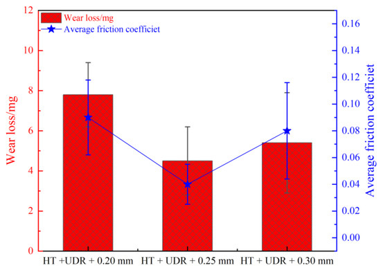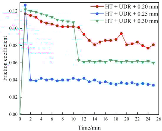 The initial friction coefficient of HT + UDR + 0.20 mm was the smallest, and it fluctuated more. The initial friction coefficient of HT + UDR + 0.25 mm was the largest, but it quickly reached the stable stage. The initial friction coefficient of HT + UDR + 0.30 mm was in the middle, then gradually decreased, then dropped sharply at 10 min, and gradually fluctuated steadily. The surface quality under the 0.20 mm preloading depth was relatively poor with pits and grooves, which resulted in contact stress concentration, local friction heat, high adhesion, and oxide, promoting the friction coefficient to fluctuate in an unstable way. Tribology mentioned in molecular mechanical theory that there were many tiny bumps on the smooth surface from the atomic scale. When the normal pressure was more than the elastic limit of the material, the bump at the top of the plastic deformation happened, crushed into a flat, and then touched each other. The distance between two objects decreased, with small molecular attraction to the scope of work, and atomic bonding occurred between two compressed surfaces. Therefore, the initial friction coefficient was the largest under 0.25 mm. After the preloading depth HT + UDR + 0.30 mm treatment, microcracks and pits appeared on the surface of the coating, which needed a long period of wear in the first and second stages before entering the stable wear stage.