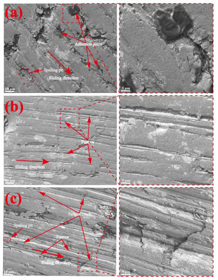 Figure 12 shows the surface wear morphologies of the dry sliding friction under different preloading depths. The wear surface of HT + UDR + 0.20 mm showed flake peeling, with spalling pits and adhesion points. The furrows were wide and deep, accompanied by the accumulation of debris. There were many pits and rough peaks on the surface, and the rough peaks were cut during dry sliding wear, resulting in adhesion on the worn surface. Further wear generated more friction heat and aggravated adhesion, eventually forming larger adhesion points. The main forms of friction wear were adhesive wear and fatigue wear. There were many furrows on the wear surface under the 0.25 mm preloading depth in Figure 12b, and the furrows were narrow and shallow. The furrows were parallel to each other and moved in the same direction as the friction pair, without obvious cracks and spalling pits. There were no obvious defects on the surface of the coating before wear, and the friction curve showed that the sample entered the stable wear stage from the point contact transition surface. The width and depth of scratches and furrows in the silver–white area were smaller than those in the black area, which was attributed to the higher hardness and strength of hard phases (such as WC), as well as strong wear resistance and deformation. The friction and wear of the hard phase in the coating was a “skeleton” effect, and the soft phase exhibited good capability of plastic deformation. The embedded WC hard phases in Ni and Fe underwent plastic deformation, absorbed energy, and prevented the hard phase from peeling, thus achieving the effect of the “strong and tough bonding”. The main wear form was abrasive wear. In Figure 12c, there were deep furrows and fatigue cracks, as well as spalling pits at the crack edges. On the surface of high hardness, the pin plate with the sample in the process of wear and tear led to the extrusion edge grinding crack area of the bulge and increased some parts that were prone to large stress concentration. The area of the bulge was separated from the surface under the repeated friction of the pin plate to form a high hardness abrasive grain and then fell into the furrow area to form three-body abrasive wear of the pin plate, high hardness abrasive grain, and coating, thus generating deeper furrows during the wear process. As the yield stress of the material is certain, cyclic stress was formed in the contact area with continuous wear. When the cyclic stress was greater than the yield stress of the material, the coating surface underwent irreparable plastic deformation, and microcracks occurred and expanded to a certain extent on the surface, resulting in material fracture and spalling. The main wear forms were fatigue wear and abrasive wear.