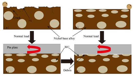 The mechanism analysis pre and post wear resistance strengthening is shown in Figure 13. The surface defects of the coating were eliminated by high-temperature ultrasonic deep rolling, and WC particles were dispersed in the coating structure. At the same time, the surface hardness of the coating was improved and the residual compressive stress was introduced to further improve the wear resistance of the coating [32]. In the early stage of wear, the pin plate was continuously squeezed and rotated along the surface of the Ni-WC coating to cause friction and wear. The hardness of the nickel-based alloy is smaller than that of the WC particles, and it is quickly removed by the asperities on the surface of the pin plate, exposing the skeleton of the WC particles, which can effectively block the ploughing of the abrasive particles on the nickel-based alloy area. The convex WC particles and the concave nickel-based alloy structure continuously flow into the concave nickel-based alloy area during the wear process, avoiding the sliding of the wear debris between the pin plate and the coating and reducing the probability of plastic deformation and spalling on the coating surface. With the increase of wear time, the height of WC particles reaches the concave area, and the next cycle is carried out until the wear fails. The preloading depth mainly affects the degree of plastic deformation of the coating. With the increase in preloading depth, the surface roughness and microhardness of the coating increased first and then decreased, and the tribological properties increased first and then decreased.