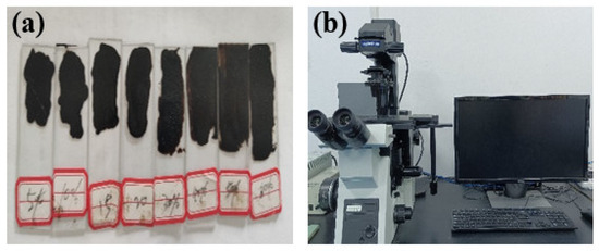 The micro-surfacing slurry was made and maintained for 48 h at 25 °C. Then, the test (shown in Figure 5) was conducted according to the Standard Test Methods of Bitumen and Bituminous Mixtures for Highway Engineering (JTG E20-2011) [24], which, referring to ISSA, is the TB147 load wheel tracking test in the Recommended Performance Guidelines for Micro Surfacing (ISSA A143) [27]. The Lateral Displacement Specific Gravity, LVD, of mixtures was fabricated and rolled 1000 times at 25 °C under a weight of 125 lb (56.71 kg). Micro-surfacing slurries using WE/A binder with a WER content of 0%, 5%, 10% and 15% were mixed and tested.