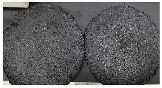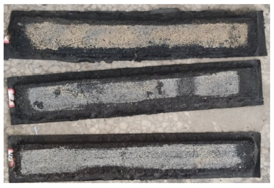 The micro-surfacing slurry was put on the horizontal and firm ground for 48 h at 25 °C. The test was undertaken according to the Field Test Methods of Highway Subgrade and Pavement (JTG 3450-2019) [26]. Micro-surfacing slurries using WE/A binder with a WER content of 0%, 5%, 10% and 15% were mixed.