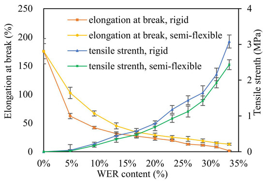 In this study, the elongation at break and the tensile strength at 25 °C of WE/A with the WER content ranging from 0% to 33.3% were tested. The test results are shown in Figure 14. The overall trend is that the tensile strength increases with the increase in WER content, while the elongation decreases with it. When the content of the WER was 0, the tensile strength of the test specimen was too low to be measured. When the content of the WER was from 5% to 30%, for WE/A with a semi-flexible and rigid WER, the tensile strength was positively correlated with the amount of WER. When the content of WER was over 30%, the tensile strength of WE/A increased rapidly as the content of WER increased.