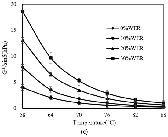 G*/sin δ always regards the rut factor and evaluates the high temperature performance of asphalt. As shown in Figure 15c, the rutting factor became larger with increasing WER content at the same temperature. Moreover, the rutting factor showed a decrease with increasing temperature, regardless of the amount of the WER dosing. This is mainly due to the cured WER, which continuously exists in the WE/A as a spatial network, and the WER frame can provide most strength when bearing shear stress. As a result, WE/A had better high temperature performance due to the addition of WER.