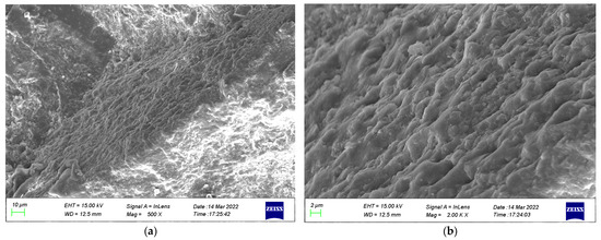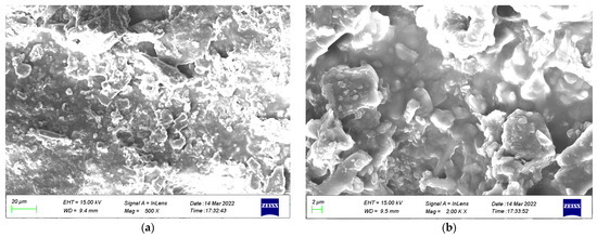 Micro-structure of aggregate, WER content 10%: (a) 500×; (b) 2000×.