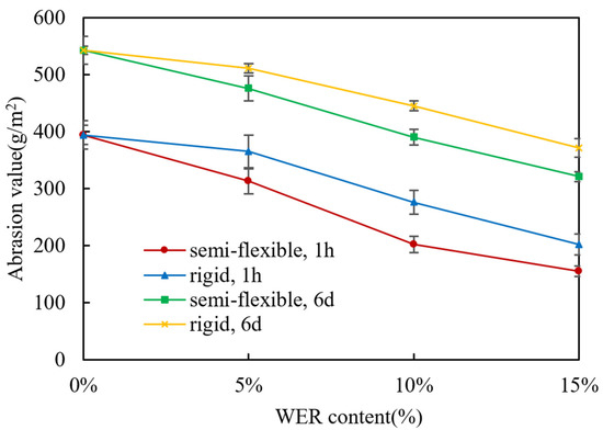 During the test, the abrasion value of the specimen immersed for 1 h was used to reflect its peeling resistance, and the abrasion value of the specimen immersed for 6 days was used to reflect its water damage resistance [28]. As shown in Figure 21, when WER content was 5%, 1 h abrasion resistance values of rigid and semi-flexible samples reduced by 7.3% and 20.6%, respectively, whereas 6 days abrasion resistance values of rigid and semi-flexible samples reduced by 5.8% and 12.2%, respectively. When WER content was 10%, 1 h abrasion resistance values of rigid and semi-flexible samples reduced by 30% and 48.7%, respectively, and 6 d abrasion resistance values of rigid and semi-flexible samples reduced by 18% and 28%, respectively. This proves that less WER could effectively improve the bonding performance of the interface between aggregate and asphalt in micro-surfacing.