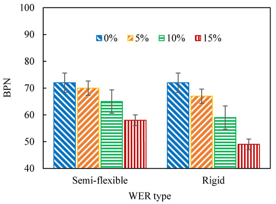 The improvement in anti-sliding performance of pavements is mainly caused by fine aggregate texture on the surface of the micro-surfacing mixture. However, the anti-slip performance of different binders is different. Figure 22 reveals that the reduction in BNP values for rigid specimens was greater than for the semi-rigid specimens. Therefore, the micro-surfacing with more content of WER had worse skid resistance. Semi-flexible WER micro-surfacing had better skid resistance than rigid WER micro-surfacing. According to engineering statistical work, the Sideway Force Coefficient of asphalt pavement was usually higher than 50 when the BPN was higher than 60, and rapidly reduced to under 35 when the BPN decreased below 60.