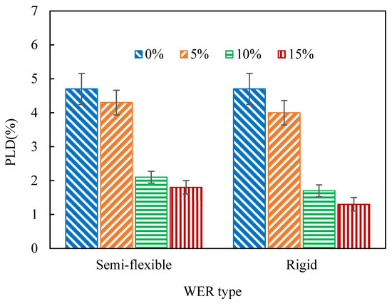 The thickness of micro-surfacing slurry usually does not exceed 1.5 cm on the pavement, so the rutting resistance of micro-surfacing is usually evaluated by the percentage of width deformation (PLD) instead of dynamic stability of the asphalt mixture thicker than 4 cm. Figure 23 shows that the PLD values for both the semi-rigid and rigid specimens decreased with increasing WER doping, and the decrease range was essentially the same. Moreover, less than 5% WER could barely reduce the PLD of specimens compared with specimens without WER. A total of 10% WER could enhance the rutting resistance of micro-surfacing substantially. When the content of WER was more than 10%, the modification effect did not increase with the adding of more WER, and the cured reaction formed into a continuous phase.