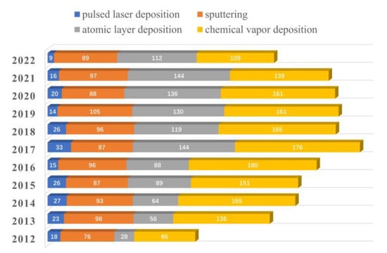 The functional layer is an important part of the storage mechanism in lithium-ion batteries, as it helps to improve the performance and stability of the interface and allows for the efficient transfer of ions and electrons. The film deposition techniques are vital for the development of lithium-ion batteries by providing a functional layer at the interface between electrode and electrolyte, which fabricates a solid-state battery with a different approach from the traditional methods. Considering the unfriendly effect of water-based strategies on environmental pollution regardless of their excellent uniformity, we choose two kinds of film deposition techniques here, namely, physical and chemical processes. In fact, in recent years, the number of papers using thin film deposition techniques to treat the surface of lithium-ion batteries has maintained a high degree of concern (Figure 1), which confirms its important role in lithium-ion batteries.