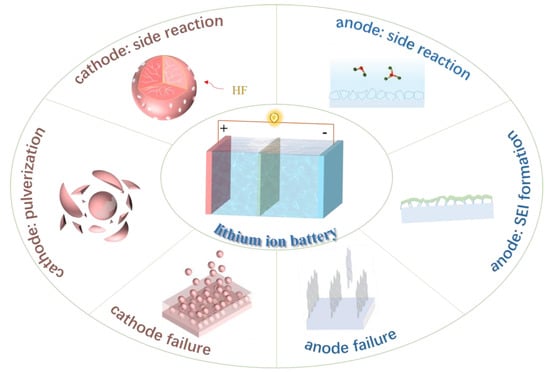 Schematic illustration of issues at the interface of electrode/electrolyte in lithium-ion batteries.