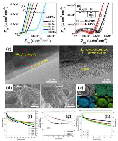 LiPON is one of the most competitive solid electrolytes due to its wide voltage window (0-5.5 V) and compatibility with lithium metal except for its low ionic conductivity (1−3 × 10−6 S cm−1 at 25 °C) [119]. To enhance the ionic conductivity of LiPON electrolytes, the approach of lithium compensation was employed from a lithium-rich target in the sputtering process [55]. As a result, moderate enhancement of ionic conductivity was evidenced for Li-LiPON with 3.6 × 10−6 S cm−1, compared to 2.4 × 10−6 S cm−1 for normal LiPON sputtered from Li3PO4. Consequently, rate performance was improved in the structure of LiCoO2 (0.45 μm)/Li-LiPON (1.49)/Li with 98% capacity retention when the current rate decreased from 4 C to 0.1 C, compared to 90% for normal LiPON. The improved rate capability originated from increased ionic conductivity and an augmented amount of lithium ions. In addition, it is interesting that this research work found that the lithium-ion conductivity (σ) of the LiPON electrolyte layer gradually increased when the working pressure decreased from 0.5 to 0.2 Pa; and when the working pressure decreased to 0.08 Pa, σ decreased significantly (Figure 6a). According to the corresponding equivalent circuit (Figure 6b), LiPON sputtered from Li3.3PO4 is indeed lower in resistance than Li3PO4. Sputtering techniques enable the conformal coating on the surface of the particles as presented in Figure 6c, preserving clear boundaries and uniform elemental dispersion (Figure 6d,e) [120]. Moreover, a nanometer LiPON layer was deposited on the surface of LiNi0.8Mn0.1Co0.1O2 (NMC811) powder via sputtering and exhibited improved electrochemical performance compared to bare-NMC811 [121]. The film thickness was controlled by sputtering time and power. The optimized condition was obtained (25 W, 6 min) in Figure 6f with 64% capacity retention in solid-state batteries. The rate performance was improved after lithium-ion conducting LiPON solid electrolyte coating as shown in Figure 6g. In the full-cell configuration, it performed well under a cutoff voltage of 4.1, 4.2, and 4.3 V (Figure 6h). However, the thicker coating would block lithium-ion migration and degrade cell performance.