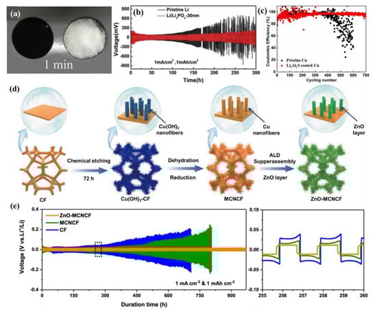 - Zhang, R.; Li, Y.; Qiao, L.; Li, D.; Deng, J.; Zhou, J.; Xie, L.; Hou, Y.; Wang, T.; Tian, W.; et al. Atomic layer deposition assisted superassembly of ultrathin ZnO layer decorated hierarchical Cu foam for stable lithium metal anode. Energy Storage Mater. 2021, 37, 123–134. [Google Scholar] [CrossRef]
