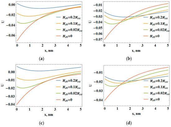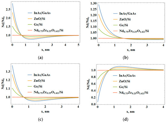 The spatial redistribution of the concentration of conduction electrons in the presence of various types of defects and at different average values of the electron concentration: (a) θd = 10 eV, n0 = 1020 cm−3; (b) θd = 10 eV, n0 = 1018 cm−3; (c) θd = 5 eV, n0 = 1018 cm−3; (d) θd = −5 eV, n0 = 1018 cm−3.