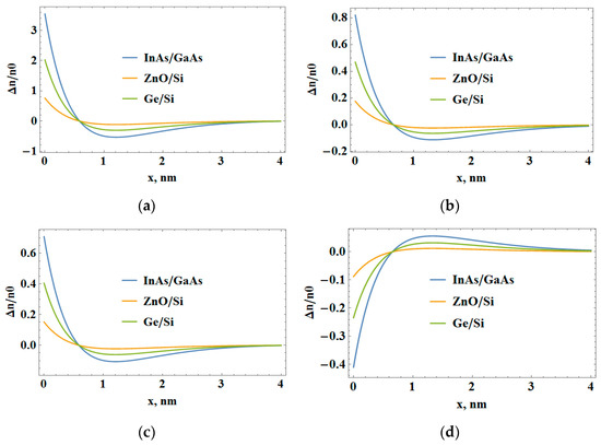 Figure 1 shows the results of calculating the coordinate dependence of crystal lattice deformation of the InAs film on the GaAs substrate (Figure 1a,b) and the Ge film on the Si substrate (Figure 1c,d) with interstitial atoms (Figure 1a,c) (θd = 10 eV > 0) and substitution impurities with a smaller ionic radius (Figure 1b,d) (θd = −5 eV < 0) at different values of the average defect concentration. The film parameters and the mismatch of lattice parameters of the film and the substrate are given in Table 1 [23,24,25].
